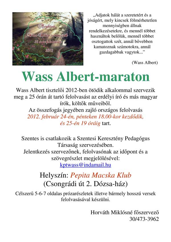 Wass Albert tisztelői 2012-ben ötödik alkalommal szervezik meg a 25 órán át tartó felolvasást az erdélyi író és más magyar írók, költők műveiből. Az összefogás jegyében zajló országos felolvasás 2012. február 24-én, pénteken 18.00-kor kezdődik, és 25-én 19 óráig tart. Szentes is csatlakozik a Szentesi Keresztény Pedagógus Társaság szervezésében. Helyszín: Pepita Macska Klub (Csongrádi Út 2. Dózsa-ház). Célszerű 5-6-7 oldalas prózarészletek illetve bármely hosszú versek felolvasásával készülni.