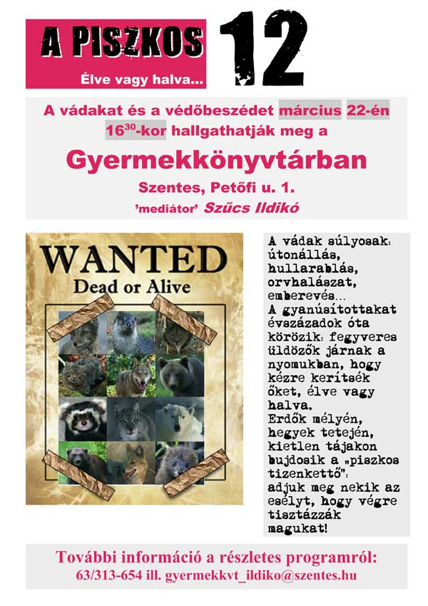 A vádak súlyosak: útonállás, hullarablás, orvhalászat, emberevés… A gyanúsítottakat évszázadok óta körözik: fegyveres üldözők járnak a nyomukban, hogy kézre kerítsék őket, élve vagy halva. Erdők mélyén, hegyek tetején, kietlen tájakon bujdosik a „piszkos tizenkettő”: adjuk meg nekik az esélyt, hogy végre tisztázzák magukat! A vádakat és a védőbeszédet március 22-én 16.30-kor hallgathatják meg a Gyermekkönyvtárban (Szentes, Petőfi u. 1.) ’mediátor’ Szűcs Ildikó.