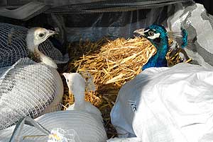 A sláger a papagájok minden fajtája, de volt itt még páva is. Csak úgy tájékozódásként mondjuk, hogy a képen látható páva pár (a díszesebb tollazatú) 90 ezer forint volt. Tudni kell róluk, hogy nagy hely szükséges a tartásukhoz, de nem volt olyan járókelő ki nem állt meg megcsodálni a pávákat.