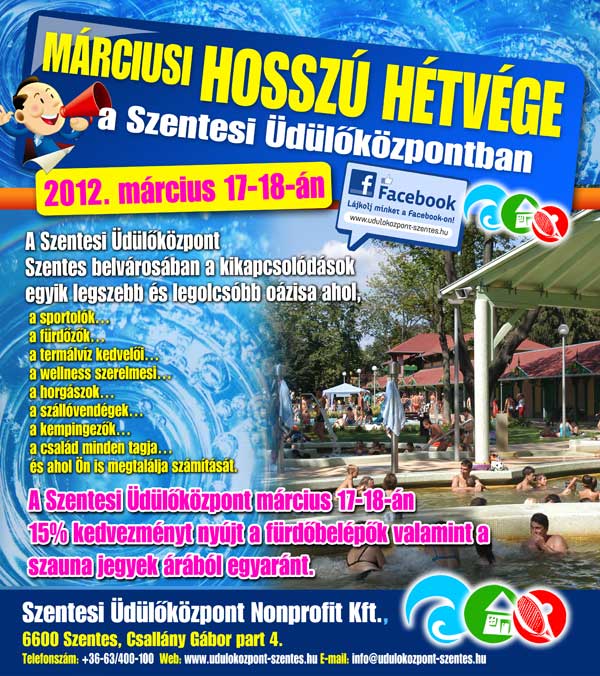 A Szentesi Üdülőközpont március 17-18-án 15% kedvezményt nyújt a fürdőbelépők valamint a szauna jegyek árából egyaránt.