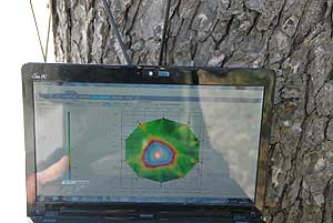 A monitoron láthatjuk, hogy a fa keresztmetszetéhez képest mekkora darabon keletkezett üreg a törzsben!