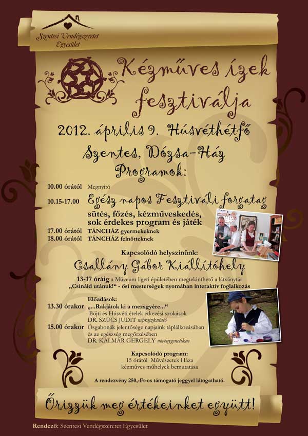 Az idei évben immár második alkalommal rendezi meg a Szentesi Vendégszeretet Egyesület a Kézműves Ízek Fesztiválját. A rendezvénynek a Kurca-partján lévő Dózsa Ház ad otthont 2012. április 9-én, Húsvéthétfőn. A rendezők várják mindazokat, akik a locsolkodás helyett vagy azt követően tartalmasan szeretnék az ünnepet eltölteni. Az idelátogatók régi, lassan feledésbe merülő ételeket kóstolhatnak meg és bekapcsolódhatnak ezek elkészítésébe, sőt egy újabb recepttel is gazdagodhatnak. A nap folyamán egyéb színes programok várják az érdeklődőket: tojásfestés és karcolás mellett fafaragás és a kovácsmesterség is kipróbálható lesz. Akinek mindez nem elég, azok átsétálhatnak a Széchenyi Ligetben található Csallány Gábor Kiállítóhelyhez, ahol délutántól egyéb tartalmas programokat kínálnak. A napot gyermek majd felnőtt táncházzal zárják a szervezők.