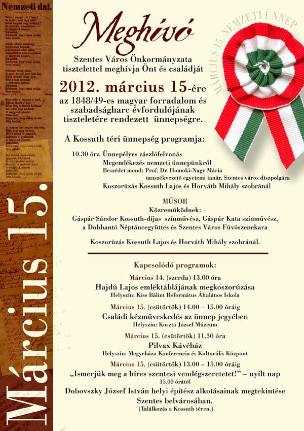 Szentes Város Önkormányzata tisztelettel meghívja Önt és családját 2012. március 15-ére az 1848/49-es magyar forradalom és szabadságharc évfordulójának tiszteletére rendezett ünnepségre. A Kossuth téri ünnepség programja: 10.30 óra Ünnepélyes zászlófelvonás Megemlékezés nemzeti ünnepünkről. Beszédet mond: Prof. Dr. Homoki-Nagy Mária tanszékvezető egyetemi tanár, Szentes város díszpolgára Ünnepi műsor - Közreműködnek: Gáspár Sándor Kossuth-díjas színművész, Gáspár Kata színművész, a Dobbantó Néptáncegyüttes és Szentes Város Fúvószenekara