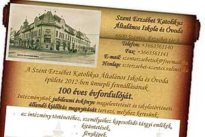 A Szent Erzsébet Katolikus Általános Iskola és Óvoda épülete 2012-ben ünnepli fennállásának 100 éves évfordulóját. A z intézmény ez alkalomból jubileumi évkönyvet kíván megjelentetni az iskola történetéről, valamint állandó kiállításhoz várnak az iskolával kapcsolatos relikviákat. Pl. (a teljesség igénye nélkül felsorolunk egy párat) kitüntetéseket, fényképeket, díszdiplomákat, diáköltözékeket és sport emlékeket. A felajánlott tárgyakat fénymásolják, digitalizálják és maradéktalanul vissza adják. A tárgyi emlékeket 2012. augusztus 31-ig várják az iskolában!
