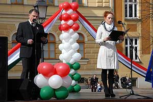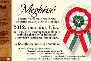 Szentes Város Önkormányzata tisztelettel meghívja Önt és családját 2012. március 15-ére az 1848/49-es magyar forradalom és szabadságharc évfordulójának tiszteletére rendezett ünnepségre. A Kossuth téri ünnepség programja: 10.30 óra Ünnepélyes zászlófelvonás Megemlékezés nemzeti ünnepünkről. Beszédet mond: Prof. Dr. Homoki-Nagy Mária tanszékvezető egyetemi tanár, Szentes város díszpolgára Ünnepi műsor - Közreműködnek: Gáspár Sándor Kossuth-díjas színművész, Gáspár Kata színművész, a Dobbantó Néptáncegyüttes és Szentes Város Fúvószenekara Katt a képre! Szentes, 2012. 03. 07. Nem ültetik át az Olimpiai tölgyet!