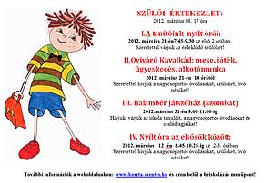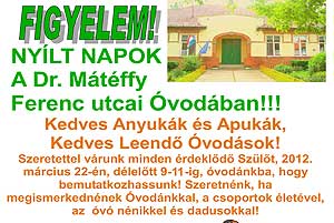 2012. március 22-én délelőtt 9.00 és 11.00 óra között várják a leendő óvodásokat és szüleiket a Dr. Mátéffy utcai óvodába, hogy megismerkedjenek az óvó nénikkel, dadusokkal és nem utolsó sorban az óvodával. Másnap viszont a "Tökmagoknak" egy tök jó napot szerveznek, ahol játékkal és mesével készülnek a kicsiknek az óvoda dolgozói. Katt a képre! Szentes, 2012. 03. 19. Nyílt órák a Klauzálban!