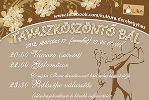Első alkalommal rendezi meg a derekegyházi Dr. Brusznyai Árpád Művelődési Ház és Könyvtár - Integált Közösségi Szolgáltató Tér 2012. március 17.-én (szombaton) 19:00 órától Tavaszköszöntő Bálját, ahol a sláger- és tánczenék mellett felcsendülnek a keringő, rock'n'roll, csa-csa-csa dallamai is - a bál hangulatát Szabó Kornél biztosítja. Szeretnének vidám, táncos programot nyújtani a hosszú hétvége szombatjára, ahol a résztvevő hölgyek között megválasztjuk a bál legszebbjét is!
