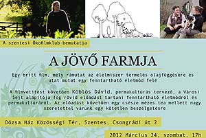 2012. március 24-én, szombaton 17 órai kezdettel a szentesi Ökofilmklub bemutatja: A JÖVŐ FARMJA. Egy britt film, mely rámutat az élelmiszer termelés olajfüggésére és utat mutat egy fenntartható életmód felé. A filmvetítést követően Köblös Dávid, permakultúrás tervező, a Városi Sejt alapítója fog rövid előadást tartani fenntartható életmódról és permakultúráról. Az előadást követően egy csésze mézes tea mellett nagy szeretettel várunk egy kötetlen beszélgetésre Dózsa Ház Közösségi Tér, Szentes, Csongrádi út 2 Katt a képre! Szentes, 2012. 03. 12. A Kálvária temető művész parcellájában lesz Bíró Jenő festőművész temetése