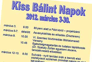 A Kiss Bálint Református Általános Iskola 2012. március 3-30. között rendezi meg a Kiss Bálint Napokat. Ezeken a napokon számos programmal várják az érdeklődőket az iskolába. Lesz ásványkiállítás, tanulmányi verseny, nyílt tanítási órák, húsvéti kézművesnap, diákok mini koncertje és végezetül a Kalungu ütőegyüttes műsora. A részletes programot a képre kattintva tekinthetik meg!