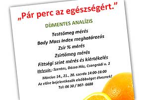 „Pár perc az egészségért.” - címmel DÍJMENTES ANALÍZIS lesz március három szerdáján (14., 21., 28.) 14:00-18:00 óra között a Dózsa Ház - Közösségi téren (Csongrádi u. 2.). Minden érdeklődőt szeretettel várnak. Bővebb információ a plakáton! Katt a képre! Szentes, 2012. 03. 08. Együtt a biztonságért