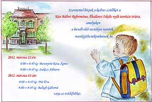 Szeretettel hívjuk a kedves szülőket a Kiss Bálint Református Általános Iskola nyílt tanítási óráira, amelyeken a leendő első osztályos tanítók munkájába tekinthetnek be. 2012. március 12-én: 8:00 – 8:45-ig: Baranyiné Kósa Ágnes 9:00 – 9:45-ig: Lukács Adrienn 2012. március 13-án: 8:00 – 8:45-ig: Piti Éva 9:00 – 9:45-ig: Balogh Gáborné várja az érdeklődőket.