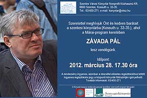 Szeretettel meghívják Önt és kedves barátait a szentesi könyvtárba (Kossuth u. 33-35.), ahol a Márai-program keretében ZÁVADA PÁL lesz a vendég. Időpont: 2012. március 28. 17.30 óra A rendezvény ingyenes, azonban a részvétel előzetes regisztrációhoz kötött. Ingyenes regisztrációs jegy a központi könyvtár földszintjén igényelhető. További információ: 63/400-271