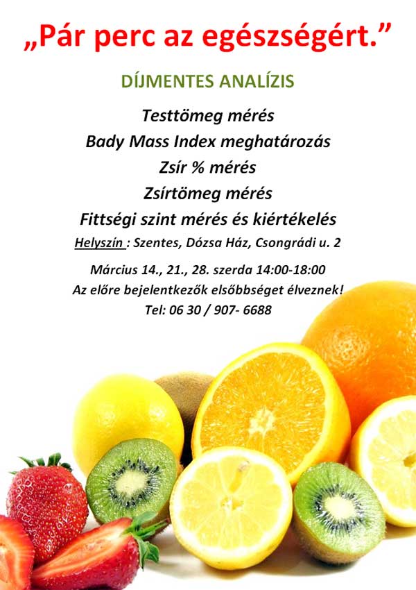 „Pár perc az egészségért.” - címmel DÍJMENTES ANALÍZIS lesz március három szerdáján (14., 21., 28.) 14:00-18:00 óra között a Dózsa Ház - Közösségi téren (Csongrádi u. 2.). Minden érdeklődőt szeretettel várnak. Bővebb információ a plakáton!