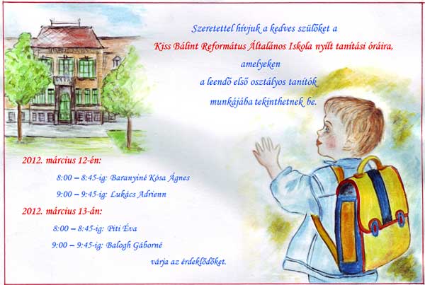 Szeretettel hívjuk a kedves szülőket a Kiss Bálint Református Általános Iskola nyílt tanítási óráira, amelyeken a leendő első osztályos tanítók munkájába tekinthetnek be. 2012. március 12-én: 8:00 – 8:45-ig: Baranyiné Kósa Ágnes 9:00 – 9:45-ig: Lukács Adrienn 2012. március 13-án: 8:00 – 8:45-ig: Piti Éva 9:00 – 9:45-ig: Balogh Gáborné várja az érdeklődőket.