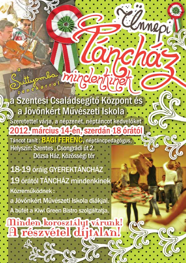 2012. március 14-én rendhagyó módon szerdán 18 órától találkozhatnak a népzenét, néptáncot kedvelők. Élő zene mellett a Jövőnkért AMI lelkes néptánc pedagógusa - Bagi Ferenc és tanítványai vezetésével és tanításával - újabb táncokat tanulhatnak! A részvétel díjtalan!