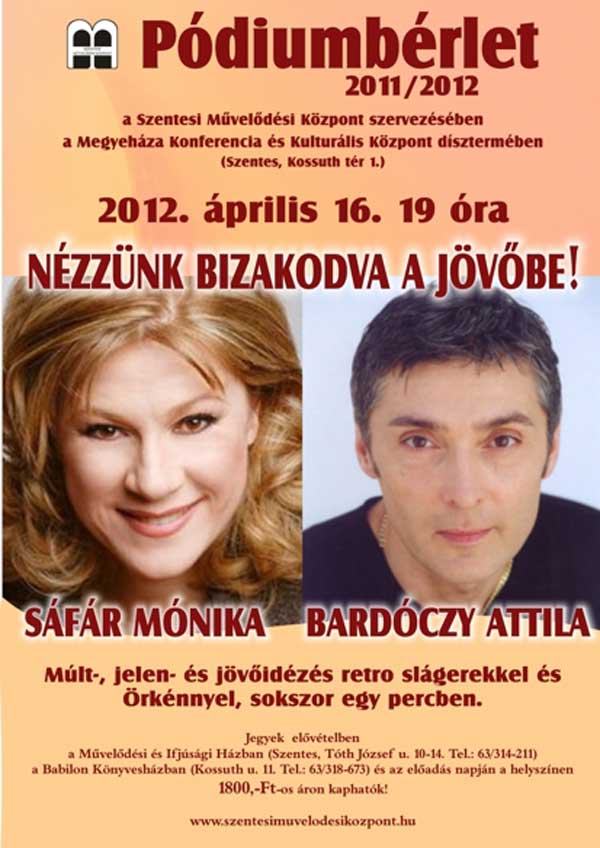 A Szentesi Művelődési Központ szervezésében a Megyeháza Konferencia és Kulturális Központ dísztermében 2012. április 16-án 19 órakor láthatjuk a Pódiumbérlet utolsó előadását NÉZZÜNK BIZAKODVA A JÖVŐBE! címmel.