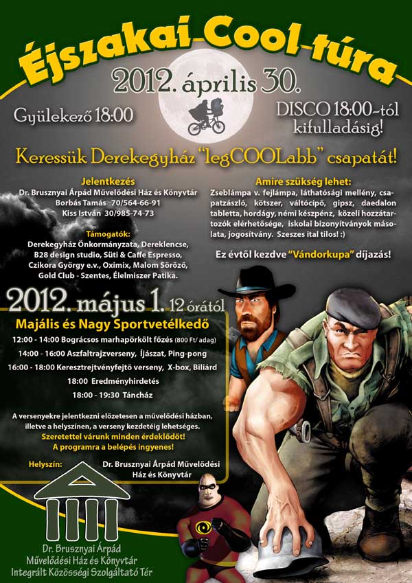 Éjszakai akadályverseny, nemcsak derekegyháziaknak! Április hónap utolsó napján izgalmas éjszakai akadályversennyel várjuk 4 fős csapatok jelentkezését 2012. április 30.-án 18:00 órától a Dr. Brusznyai Árpád Művelődési Ház és Könyvtár - IKSZT -hez. A csapatok előzetes jelentkezését várják a szervezők a plakáton látható elérhetőségeken.