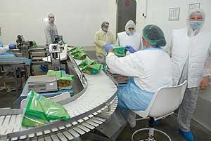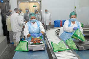Éppen csípős csirkeszárnyakat követhettünk végig futószalagon, hogy a pácolt termék hogyan ölti fel a panír bundát, és mikén sül készre. A látogatás során mindenkinek be kellett tartani az üzem nagyon szigorú élelmiszer biztonsági előírásait. Több percbe telt, mire a megfelelő ruházatot magunkra öltöttük. A munkafázis nyomon követése végén ízelítőt láthattunk az üzemben készített termékekből.