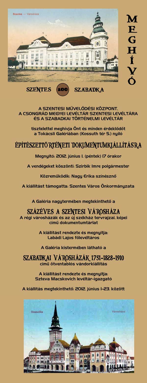 A Szentesi Művelődési Központ, a Csongrád Megyei Levéltár Szentesi Levéltára és a Szabadkai Történelmi Levéltár tisztelettel meghívja Önt és minden érdeklődőt a Tokácsli Galériában nyíló Építészettörténeti dokumentumkiállításra 2012. június 1-jén 17.00 órára.