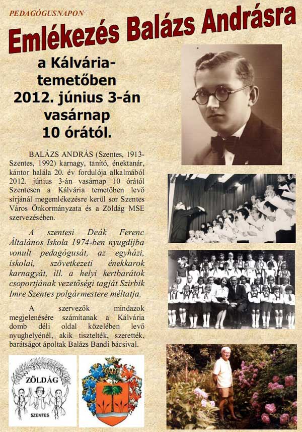 A Kálvária- temetőben 2012. június 3-án emlékeznek BALÁZS ANDRÁS (Szentes, 1913-Szentes, 1992) karnagy, tanító, énektanár, kántorra halála 20. év fordulója alkalmából.