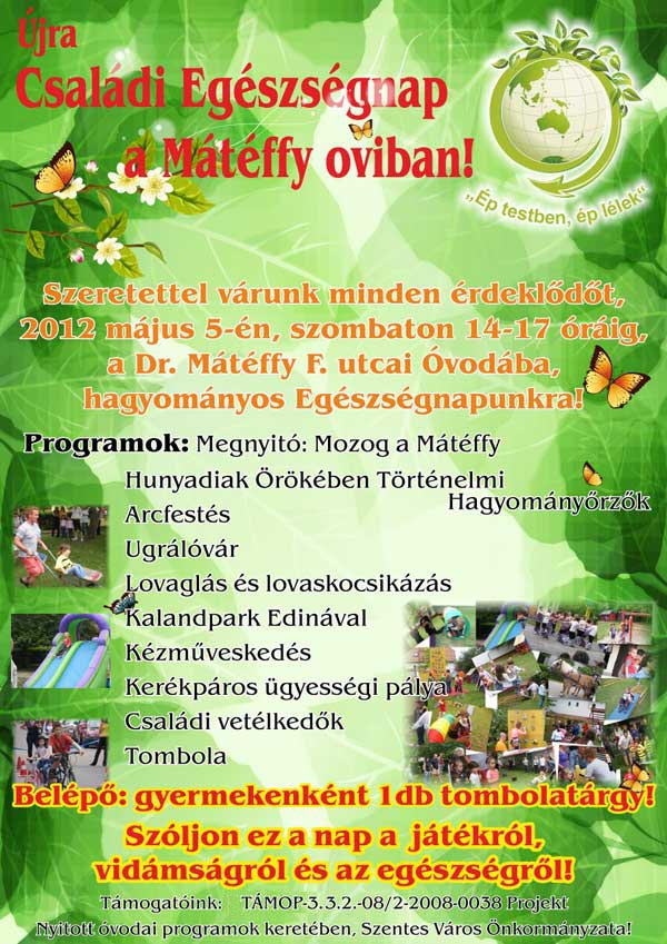 2012. május 5-én várnak minden érdeklődőt a Dr. Mátéffy F. utcai Óvodába Családi és Egészségnapra. Szombaton délután 14.00 órakor kezdődnek a programok, melyben lesz történelmi kalandozás, arcfestés, ugrálóvár, lovaglás, lovaskocsikázás, kézműveskedés stb.