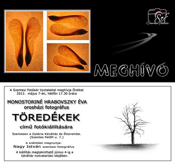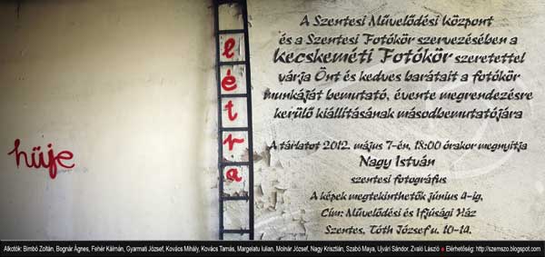 Május 7-én 17.30 órakor nyílik meg az orosházi fotós hölgy, Monostoriné Hrabovszky Éva Töredékek című fotókiállítása a Galéria Kávéház és Étteremben. Ugyanezen az estén a Művelődési és Ifjúsági Házba 18.00 órára a Kecskeméti Fotókör Hüje létra című fotókiállítás másodbemutatójának megnyitására invitál minden érdeklődőt a Szentesi Művelődési Központ és a Szentesi Fotókör. A megnyitók után az Ifjúsági Házban 18.30-tól további fotókkal mutatkozik be az orosházi alkotó. Monostoriné Hrabovszky Éva tagja a békéscsabai Márvány Fotóműhelynek, ahol önképzés szerűen sajátította el a fotografálás tudományát. Az est során szintén további képekkel és a kiállítási anyagukról egy kötetlen beszélgetéssel mutatkozik be a Kecskeméti Fotókör Szentesen. A kiállításuk címe a meghívón is megtalálható fénykép után a „hüje létra” (sántító magyarsággal) apropója nem más, mint a mai valóság. Az élet szinte valamennyi területén egy gödör fenekén vagyunk, melyből egy létra segítségével próbálunk kijutni. Ez a „hüje létra” talán a művészet - amelybe a fotózás is beletartozik. A Kecskeméti Fotókör mára már főként fiatalokból álló társulat, tagjai újra felfedezték és alkalmazzák a régmúlt fotózási technikákat. Fontosnak tartják, hogy a digitális fotográfia térhódítása mellett tovább éljenek a fotográfia kezdeteinek képkészítési eljárásai (Camera obscura, sópapír, cianotípia, olajnyomat, szénnyomat, argentotípia, stb). A mai modern technikának engedve, természetesen a digitális fényképezés is jelentős szereppel bír a fotókör életében, a most kiállított képanyaguk is így készült. A kiállítások június 4-ig látogathatók a nyitvatartási időben.