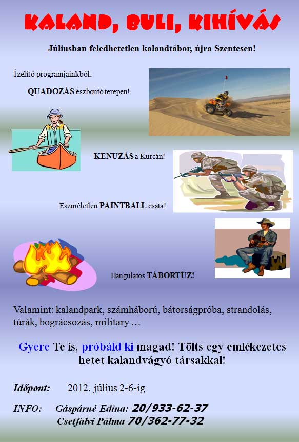 Júliusban feledhetetlen kalandtábor, újra Szentesen! Ízelítő programjainkból: QUADOZÁS észbontó terepen, KENUZÁS a Kurcán, eszméletlen PAINTBALL csata, hangulatos TÁBORTŰZ! Valamint kalandpark, számháború, bátorságpróba, strandolás, túrák, bográcsozás, military … Gyere Te is, próbáld ki magad! Tölts egy emlékezetes hetet kalandvágyó társakkal!