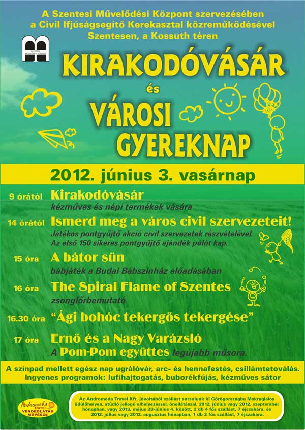 A Szentesi Művelődési Központ szervezésében 32. alkalommal rendezik meg június első vasárnapján a kirakodóvásárt. Ezen a délutánon tartják a városi gyereknapot, ahol a Pom-Pom Együttes legújabb műsorán szórakozhatunk. További részletek a plakáton!