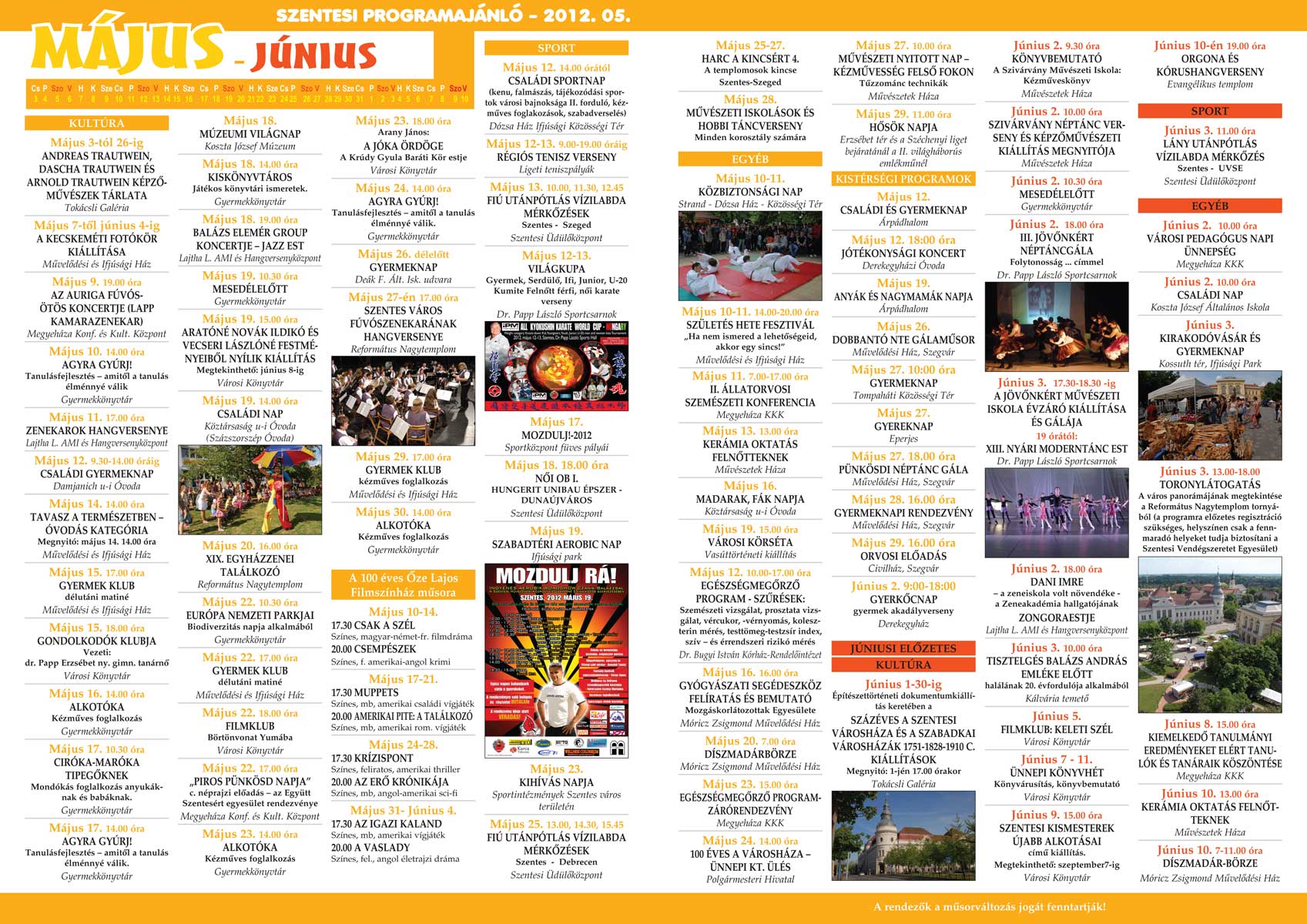 A hétvégén jelenik meg a Szentesi Programajánló 2012. májusi száma, mely a következő egy hónap időtartam programjait, rendezvényeit hivatott népszerűsíteni. Az összeállításban részletesen megtalálhatjuk a helyi zenei, színházi, sport és egyéb szórakoztató rendezvényeit és azok helyszínét és időpontját. Év elejétől annyiban változik a Programajánló megjelenése, hogy nem a Szentesi Élet Horizont magazinjában olvashatják a programajánlót, hanem a FÓR magazinban jelenik meg az.