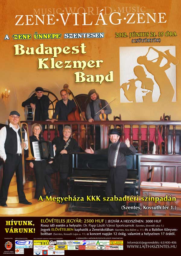 A Zene Ünnepe Szentesen 2012. június 21-én (csütörtök) 19 órakor kezdődik Szentesen a Megyeháza KKK udvarán a szabadtéri színpadon. A zene ünnepén a Budapest Klezmer Band ad koncertet, melyre 2.500 Ft (elővételben), 3.000 Ft (helyszínen) válthatnak jegyet. Rossz idő esetén a program a Dr. Papp László Városi Sportcsarnokban kerül megrendezésre.