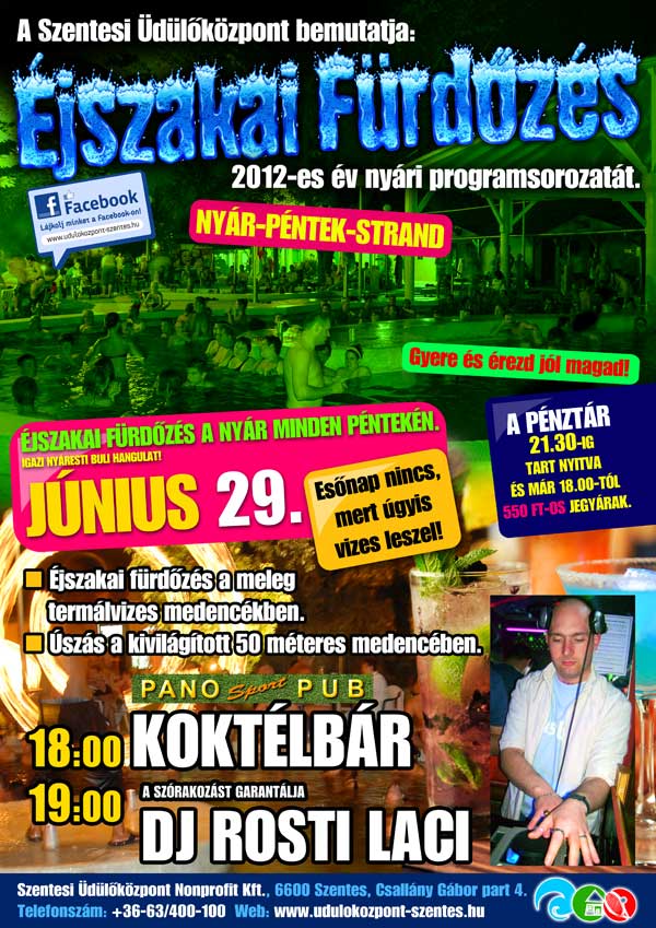 2012. június 29-én folytatódik a Szentesi Üdülőközpont nyári programsorozata az Éjszakai Fürdőzés. 18.00 órától koktélbár 19.00 órától Dj. Rosti Laci szórakoztatja a közönséget.