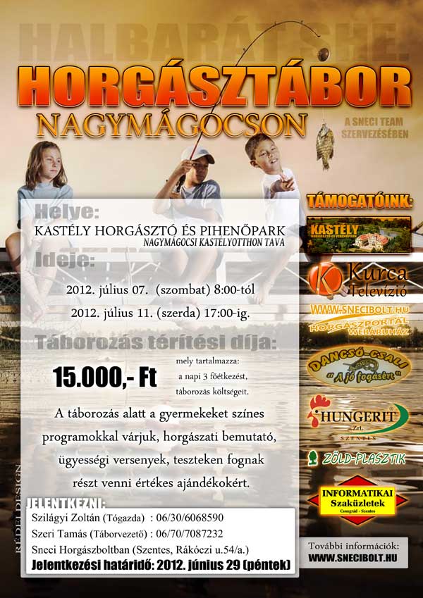 A Nagymágocsi Kastélytavon horgásztábor lesz 2012. július 7-től 11-ig. Sok szeretettel várunk 8-14 éves korig minden horgászni vágyó lurkót. Pár szóban röviden: sátorozás, napi 5 étkezés, színes programok, rengeteg ajándék és sok ponty a horgokon! Jelentkezés és további információk: Szeri Tamás 06-70-708 7232