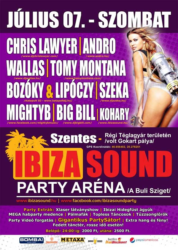 Ismét Szentesre érkezik az Ibiza Sound Party. 2012 július 7-én a régi téglagyár területén (volt gokart pályán) hatalmas party sátorral várják a szórakozni vágyó fiatalokat. Fellépők: Chris Lawyer, Andro, Wallas, Tomy Montana, Bozóky & Lipóczy, Mightyb, Szeka, Big Bill, Kohary. GPS koordináták: 46.656402, 20.278251