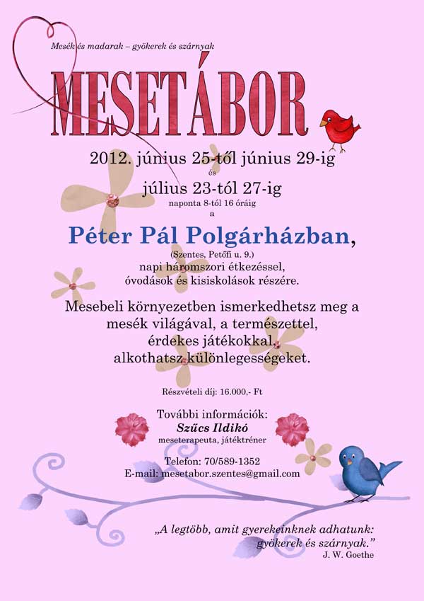 Mesetábor 2012. június 25-től június 29-ig és július 23-tól 27-ig naponta 8-tól 16 óráig a Péter Pál Polgárházban, (Szentes, Petőfi u. 9.) napi háromszori étkezéssel, óvodások és kisiskolások részére. Mesebeli környezetben ismerkedhetsz meg a mesék világával, a természettel, érdekes játékokkal, alkothatsz különlegességeket. További információk: Szűcs Ildikó meseterapeuta, játéktréner Telefon: 70/589-1352 E-mail: mesetabor.szentes@gmail.com