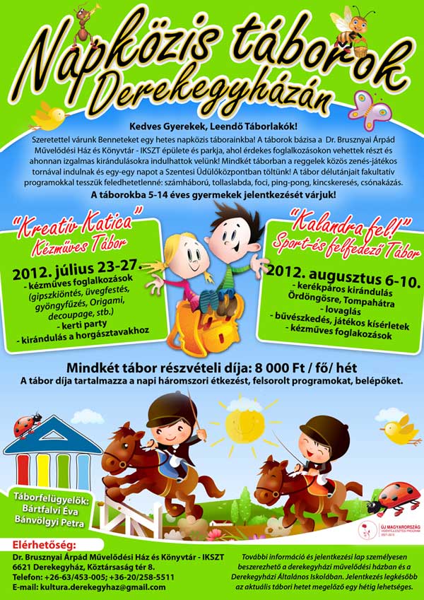Derekegyház igazi táborhelyszín! A nyárra két típusú napközis tábort hirdetünk 5-14 éves gyermekek részére, akik igazi természet közeli programokon vehetnek részt. Mindkét tábori csoport napja reggeli tornával indul, illetve a hét egyik napján strandolhatunk. Lesz kézműveskedés, lovaglás, kerékpáros és gyalogos kirándulás a horgásztavakhoz, Tompahátra és Ördöngösre. Kerti Partyn közös uzsonnakészítés, lovaglás, csónakázás, kincskeresés, bűvészkedés és játékos kísérletek. "Kreatív Katica" (július 23-27.) és "Kalandra fel!" (augusztus 6-10.) táboraink várják a jelentkezőket!