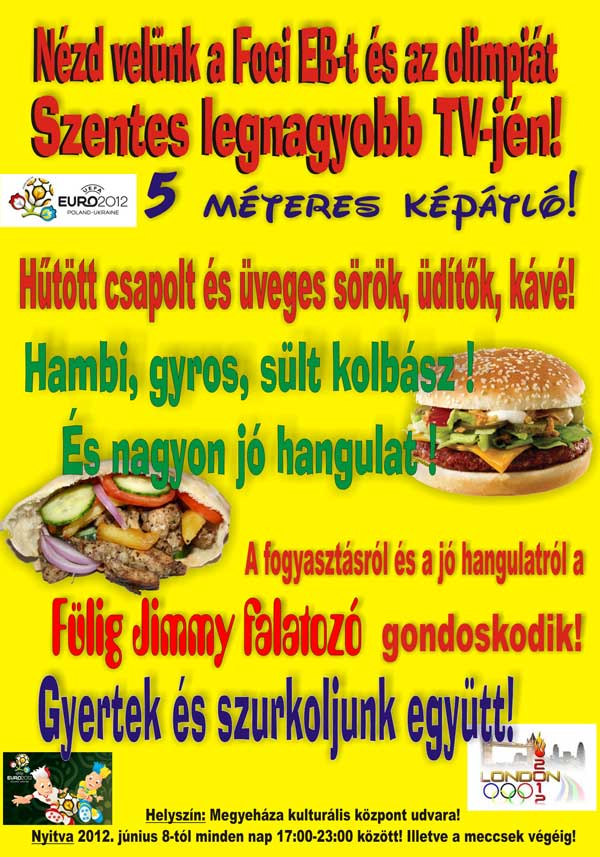 A Megyeháza udvarán idén is szurkolhatunk a magyaroknak az olimpiai közvetítéseken. Szentes legnagyobb tv-je lesz felállítva, melyen 5 méteres képátlón tekintheti meg a foci EB és a londoni olimpia közvetítéseit.