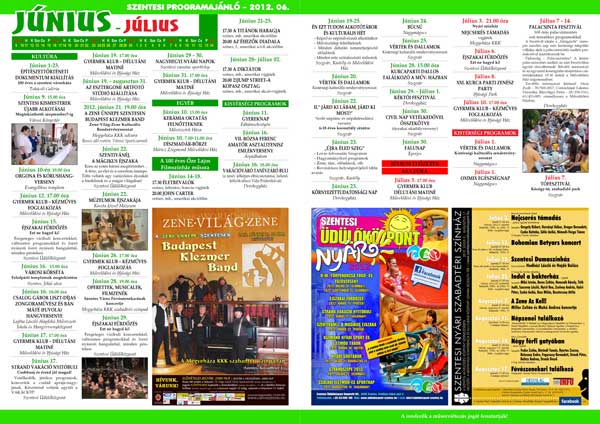 A hétvégén jelenik meg a Szentesi Programajánló 2012. júniusi száma, mely a következő egy hónap időtartam programjait, rendezvényeit hivatott népszerűsíteni. Az összeállításban részletesen megtalálhatjuk a helyi zenei, színházi, sport és egyéb szórakoztató rendezvényeit és azok helyszínét és időpontját. Év elejétől annyiban változott a Programajánló megjelenése, hogy nem a Szentesi Élet Horizont magazinjában olvashatják a programajánlót, hanem a FÓR magazinban jelenik meg.