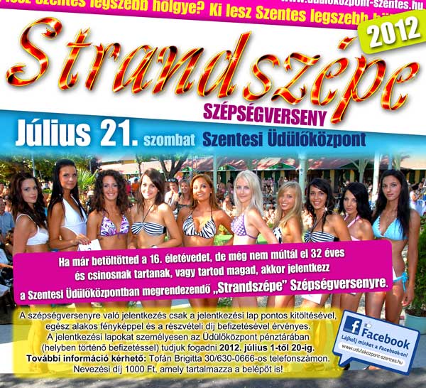 Ha már betöltötted a 16. életévedet, de még nem múltál el 32 éves és csinosnak tartanak, vagy tartod magad, akkor jelentkezz a Szentesi Üdülőközpontban megrendezendő „Strandszépe” Szépségversenyre. A szépségversenyre való jelentkezés csak a jelentkezési lap pontos kitöltésével, egész alakos fényképpel és a részvételi díj befizetésével érvényes. A jelentkezési lapokat személyesen az Üdülőközpont pénztárában (helyben történő befizetéssel) tudják fogadni 2012. július 1-től 20-ig. További információ kérhető: Tofán Brigitta 30/630-0666-os telefonszámon.