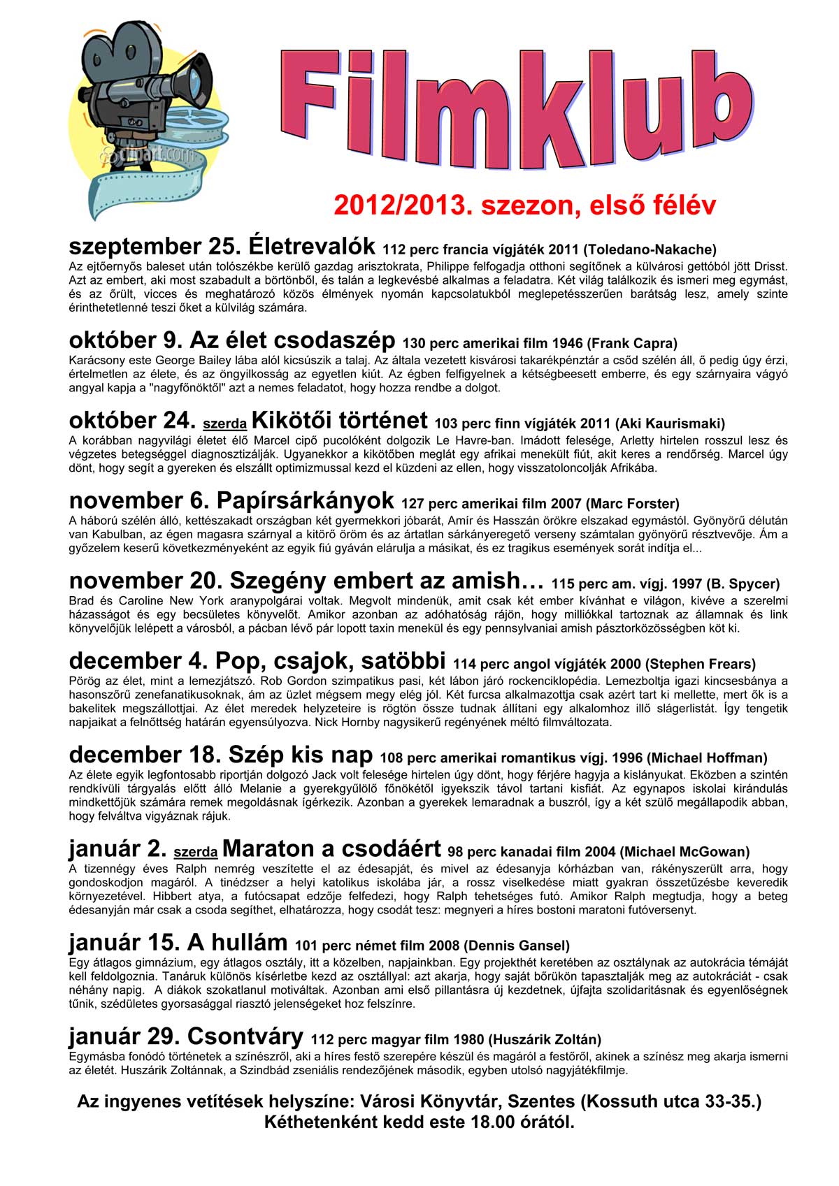 A filmrajongók figyelmébe ajánljuk az idén nyolc éves Városi Filmklub hamarosan induló új szezonját. Az ingyenes vetítések kéthetenként kedden a szentesi Városi Könyvtárban (Kossuth utca 33-35.) 18.00 órai kezdettel kerülnek megrendezésre.
