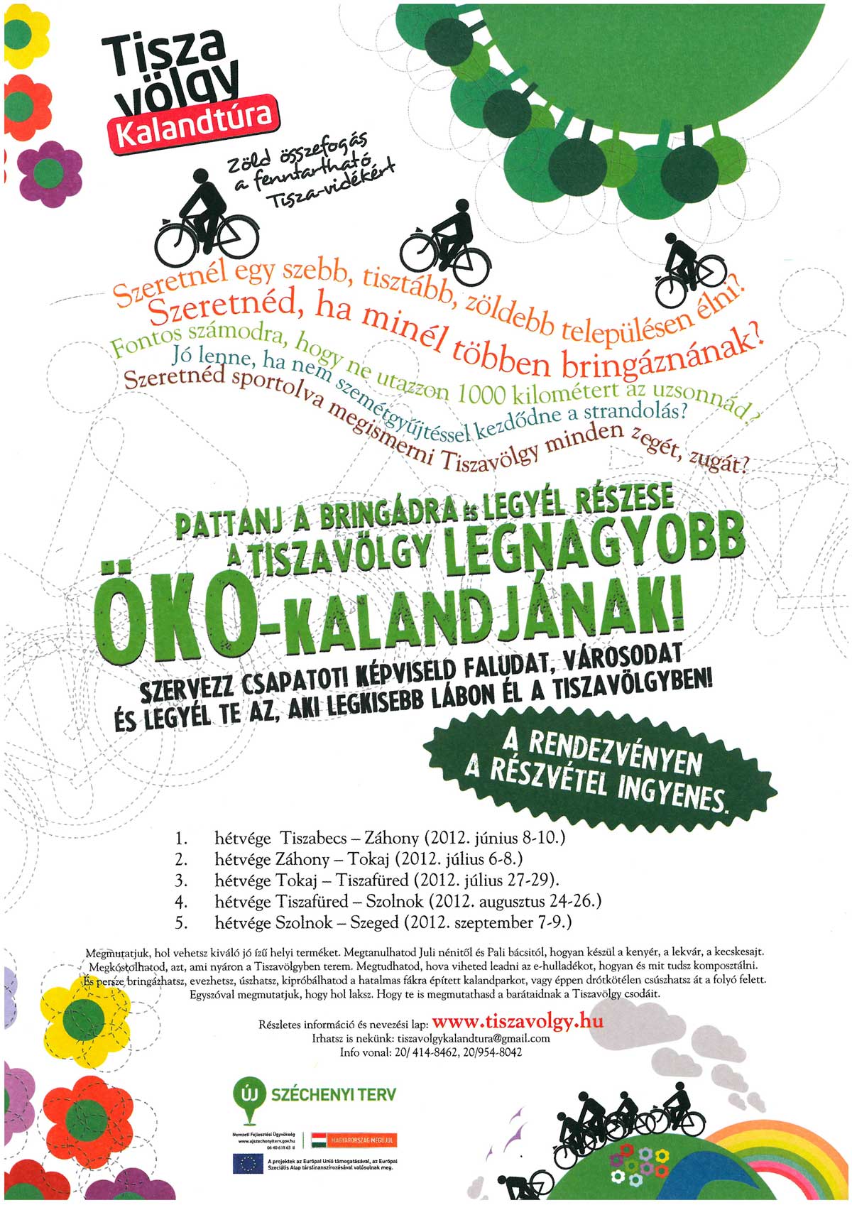 Szeretne egy szebb, tisztább, zöldebb településen élni? Szeretné, ha minél többen bringáznának? Jó lenne, ha nem szemétgyűjtéssel kezdődne a strandolás? Szeretné sportolva megismerni Tiszavölgy minden zegét, zugát? Akkor pattanjon bringára és legyen részese a Tiszavölgy legnagyobb öko-kalandjának! Szervezzen csapatot! Képviselje települését 2012. szeptember 7-9. között és legyen Ön az, aki legkisebb lábon él a Tiszavölgyben! A rendezvényen a részvétel ingyenes. Olvassa el a jelentkezés feltételeit! Részletes információ és nevezési lap: www.tiszavolgy.hu Info vonalak: 20/414-8462, 20/9548-042 Ha kérdése van, írhat is: tiszavolgykalandtura@gmail.com