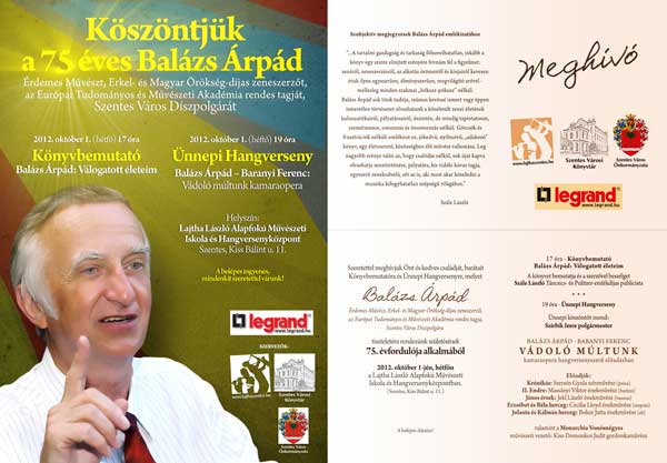 2012. október 1. hétfőn Ünnepi Hangversenyen köszöntik a 75 éves Balázs Árpád Érdemes Művészt, Erkel- és Magyar Örökség-díjas zeneszerzőt, az Európai Tudományos és Művészeti Akadémia rendes tagját, Szentes Város Díszpolgárát.