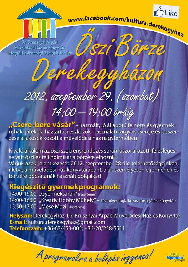 2012. szeptember 29. (szombat) 14:00 – 19:00 óráig „Csere-bere vásárt" szervezünk: használt, jó állapotú felnőtt- és gyermekruhák, játékok, háztartási eszközök, használati tárgyak cseréje és beszerzése a lakosok között a derekegyházi művelődési ház nagytermében. Kiváló alkalom az őszi szekrényrendezés során kiszortírozott, feleslegessé vált őszi és téli holmikat a börzére elhozni! Várjuk azok jelentkezését 2012. szeptember 28.-áig (elérhetőségeinken, illetve a művelődési ház könyvtárában), akik személyesen eljönnének és börzére bocsátanák használt dolgaikat!