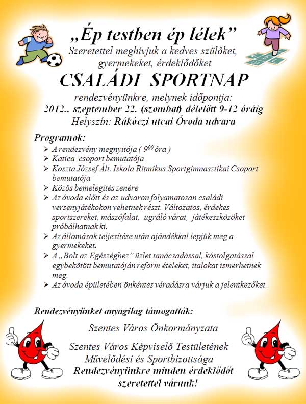 2012. szeptember 22. (szombat) délelőtt 9-12 óráig „Ép testben ép lélek” címmel rendezi meg CSALÁDI SPORTNAP-ját a Rákóczi F. utcai óvoda. Szeretettel várják a szülőket, gyermekeket, érdeklődőket a rendezvényre.
