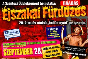 2012. szeptember 28-án ráadás éjszakai fürdőzést rendeznek a Szentesi Üdülőközpontban. Az indián nyári buli hangulatfelelőse Dj. Big Bill, és este 10 órától a Spiralfalmes tűzzsonglőr csoport perzseli fel a nyár utolsó nyomait. Jó szórakozást!