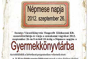 Szentes Városi Könyvtár Nonprofit Közhasznú Kft. szeretettel hívja és várja a szórakozni vágyókat 2012. szeptember 26-án 8 órától 18 óráig a Népmese napján a Gyermekkönyvtárba.