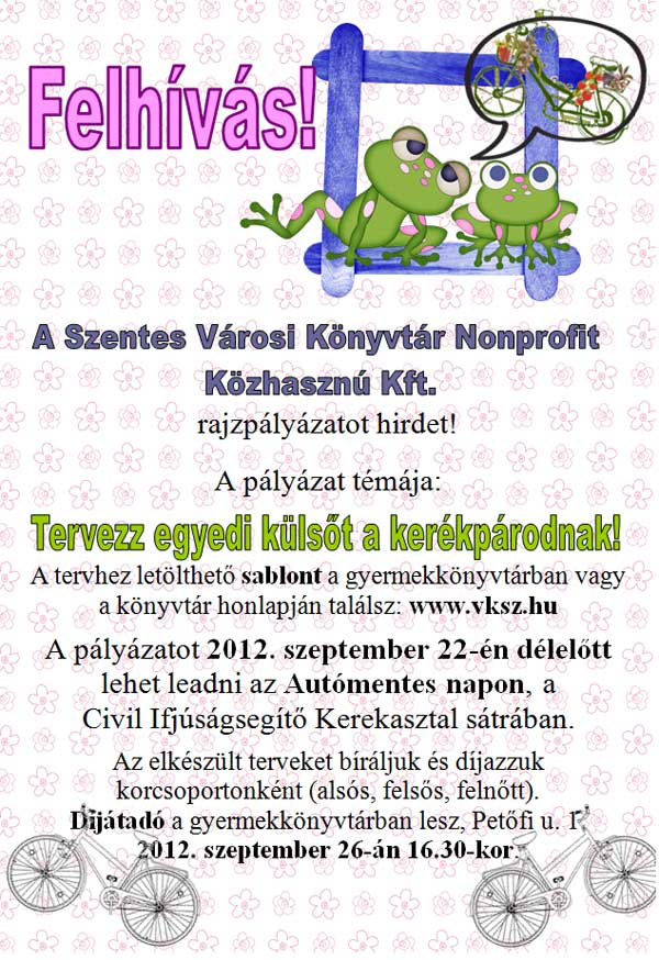 A Szentes Városi Könyvtár Nonprofit Közhasznú Kft. rajzpályázatot hirdet! A pályázat témája: Tervezz egyedi külsőt a kerékpárodnak! A tervhez letölthető sablont a gyermekkönyvtárban vagy a könyvtár honlapján találsz: www.vksz.hu, de a cikk folytatásában mi is közreadjuk! A pályázatot 2012. szeptember 22-én délelőtt lehet leadni az Autómentes napon, a Civil Ifjúságsegítő Kerekasztal sátrában. Az elkészült terveket bíráljuk és díjazzuk korcsoportonként (alsós, felsős, felnőtt). Díjátadó a gyermekkönyvtárban lesz, Petőfi u. 1. 2012. szeptember 26-án 16.30-kor.