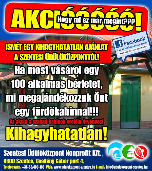 Ismét egy kihagyhatatlan ajánlat a Szentesi Üdülőközponttól! Ha most vásárol egy 100 alkalmas bérletet, mi megajándékozzuk Önt egy fürdőkabinnal!!! Az AKCIÓ a szabad kabinok erejéig érvényes! Kihagyhatatlan!