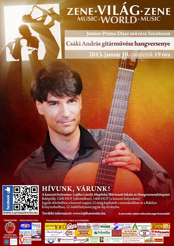 2013. január 10-én Junior Prima Díjas művész látogat el Szentesre a Hangversenyközpontba. A Zene-Világ-Zene hangversenysorozatban Csáki András gitárművész játékában gyönyörködhetünk jövő hét csütörtökön 19.00 órai kezdettel.