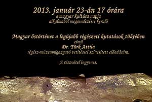 A Koszta József Múzeum szeretettel és tisztelettel várja az érdeklődőket 2013. január 23-án 17 órára a magyar kultúra napja alkalmából megrendezésre kerülő Magyar őstörténet a legújabb régészeti kutatások tükrében című Dr. Türk Attila régész-múzeumigazgató vetítéssel színesített előadására. A részvétel ingyenes.