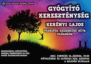 Gyógyító kereszténység címmel kerül megrendezésre a Keresztény Pedagógusok Társaságának következő programja. 2013. február 6-án (szerdán) Kerényi Lajos piarista szerzetes atya tart előadást e témában a Művelődési és Ifjúsági Házban 18.00 órai kezdettel. Minden érdeklődőt szeretettel várnak az ingyenes rendezvényre.